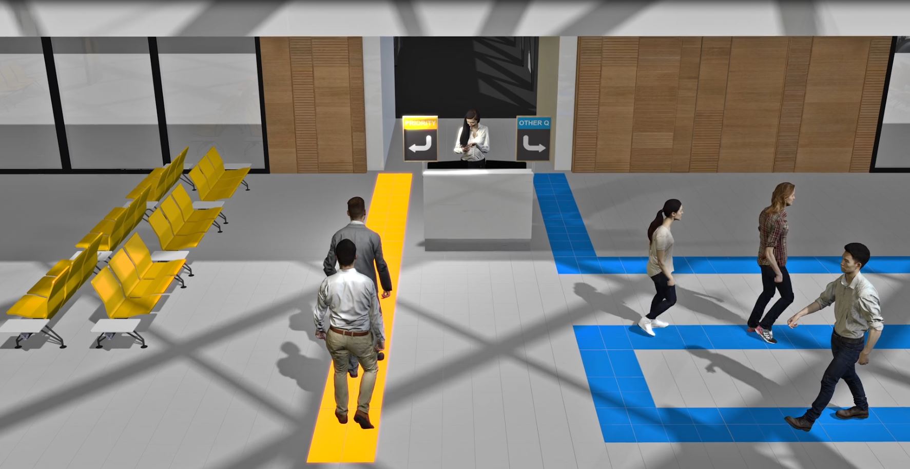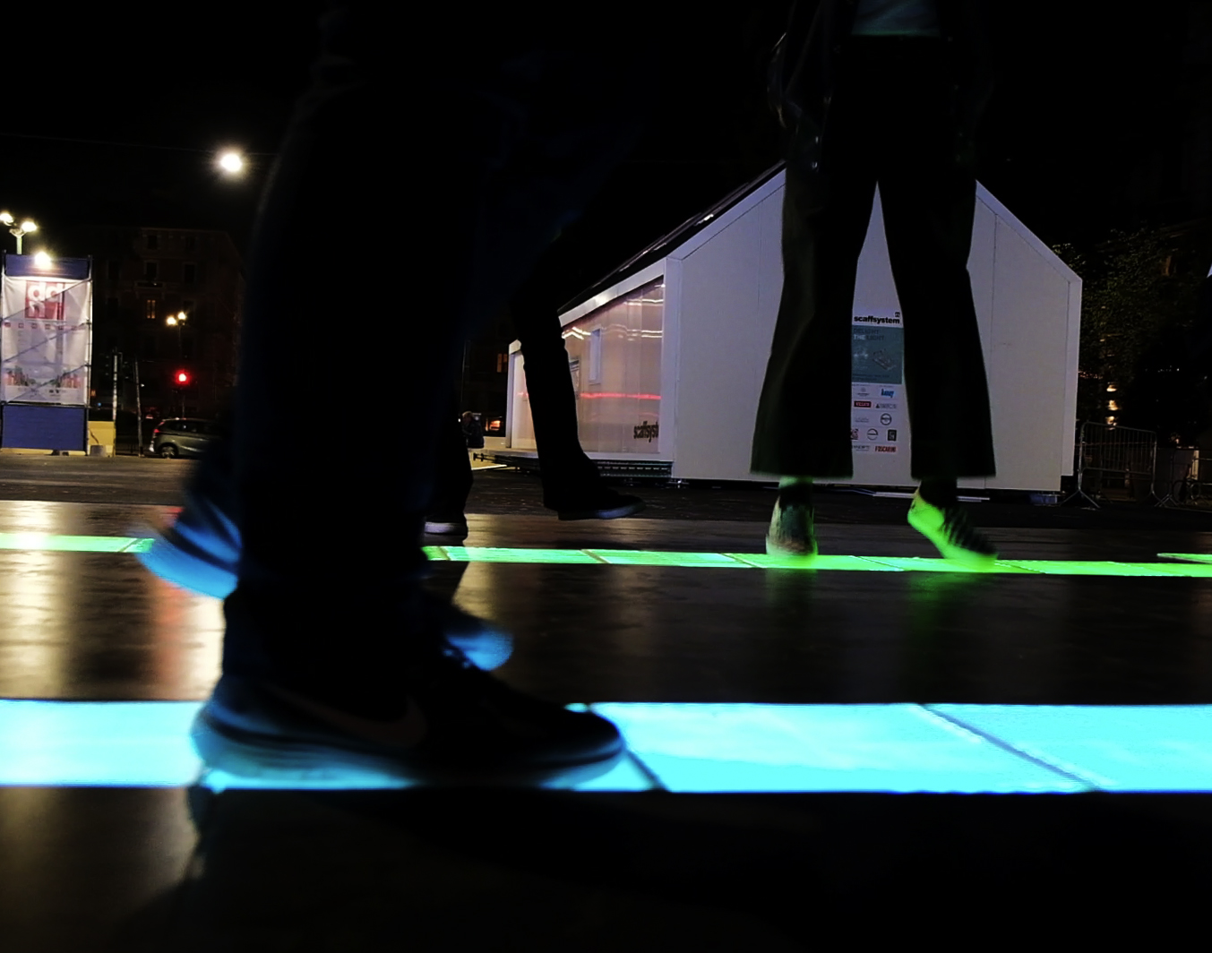 It can follow the walk of the people stepping on it, changing the color of the tiles with only a decorative aim, giving information about the way to follow for reaching a specific place (the meeting room, own table in a restaurant or the gate in an airport) or even interacting with other systems installed in the surroundings.